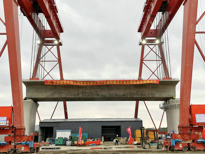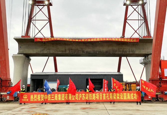 12月25日,隨著提梁機將一榀32米長雙線箱梁成功架設(shè)在東苕溪特大橋33—32#墩上,順利完成了首榀箱梁架設(shè)任務(wù),標(biāo)志著中鐵三局滬蘇湖項目正式邁入架梁施工階段,滬蘇湖鐵路建設(shè)將再次提速。