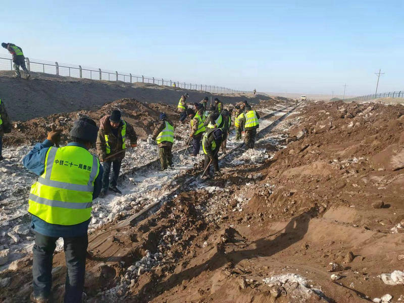 搶險(xiǎn)現(xiàn)場(chǎng)需徒步數(shù)公里才能到達(dá),入目皆是厚厚的積雪、泥沙,長(zhǎng)長(zhǎng)的鋼軌被深埋,將黑線險(xiǎn)情尤為嚴(yán)重。機(jī)械滯留在80公里之外,被深埋的軌道只能靠人工開(kāi)挖清理,在連續(xù)沙塵暴及強(qiáng)降雪的催使下,搶險(xiǎn)工作十分艱難。