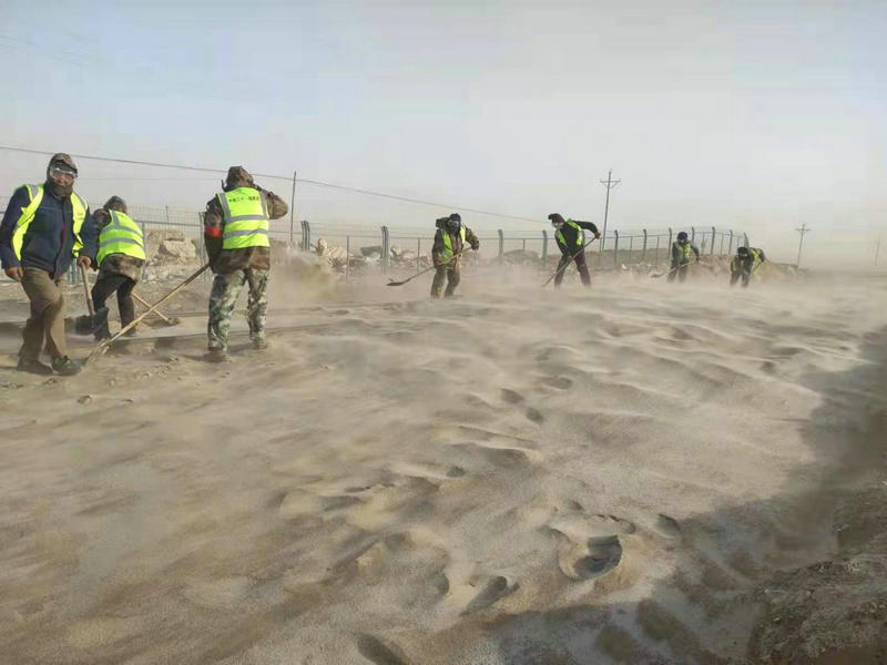 12月25日,一場(chǎng)罕見(jiàn)的大風(fēng)沙塵暴混合著強(qiáng)降雪席卷了新疆奇臺(tái)縣及吉木薩爾縣等境內(nèi),最高風(fēng)力可達(dá)十級(jí)。當(dāng)日17時(shí)許,中鐵二十一局烏將鐵路項(xiàng)目部接到烏鐵集團(tuán)通知,烏將線(準(zhǔn)東至將軍廟)、將黑線(將軍廟至黑山)多處地段被風(fēng)沙暴雪掩埋,鐵路防護(hù)網(wǎng)多處破損,導(dǎo)致將黑線鐵路運(yùn)輸被迫停止運(yùn)行,應(yīng)急搶險(xiǎn)迫在眉睫。