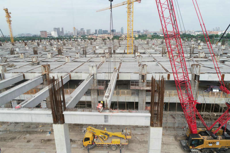該項(xiàng)目采用最新的裝配式建筑技術(shù),工程涉及6.43萬平方米的裝配式蓋板施工,具有吊裝跨度大、重量高、需同步預(yù)留上部開發(fā)條件、梁柱節(jié)點(diǎn)復(fù)雜、安裝定位精度高、接口多等技術(shù)和和質(zhì)量控制難點(diǎn)。