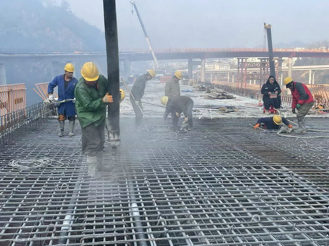 圖為現(xiàn)澆梁施工 為了確?,F(xiàn)澆梁按節(jié)點(diǎn)計(jì)劃推進(jìn)完成,項(xiàng)目部一開(kāi)始就針對(duì)施工節(jié)點(diǎn)特點(diǎn)召開(kāi)首件施工專(zhuān)題研討會(huì),制定考核獎(jiǎng)勵(lì)辦法,充分激發(fā)全員攻堅(jiān)克難積極性,優(yōu)化施工組織方案,精心計(jì)算混凝土方量,并通過(guò)定期召開(kāi)“碰頭會(huì)”研判分析施工中出現(xiàn)的問(wèn)題,制定完善的保障措施。結(jié)合砼現(xiàn)澆施工難度大、技術(shù)質(zhì)量要求高、冬季施工氣溫較低等特點(diǎn),項(xiàng)目部統(tǒng)籌安排,強(qiáng)化過(guò)程管控,以“大干120天”勞動(dòng)競(jìng)賽活動(dòng)為契機(jī),制定完善切實(shí)可行的現(xiàn)澆梁施工組織計(jì)劃,明確責(zé)任分工,加大設(shè)備、人力資源投入,科學(xué)組織,強(qiáng)抓工期,持續(xù)掀起施工現(xiàn)場(chǎng)大干熱潮,克服汛期不利因素,強(qiáng)力推進(jìn)節(jié)點(diǎn)施工。與此同時(shí),施工技術(shù)同節(jié)點(diǎn)進(jìn)度同步跟進(jìn),精準(zhǔn)測(cè)量,技術(shù)人員旁站指導(dǎo)監(jiān)督,工序施工技術(shù)交底,全過(guò)程控制混凝土塌落度,實(shí)施最佳方案,確保了工程質(zhì)量合格率100%。