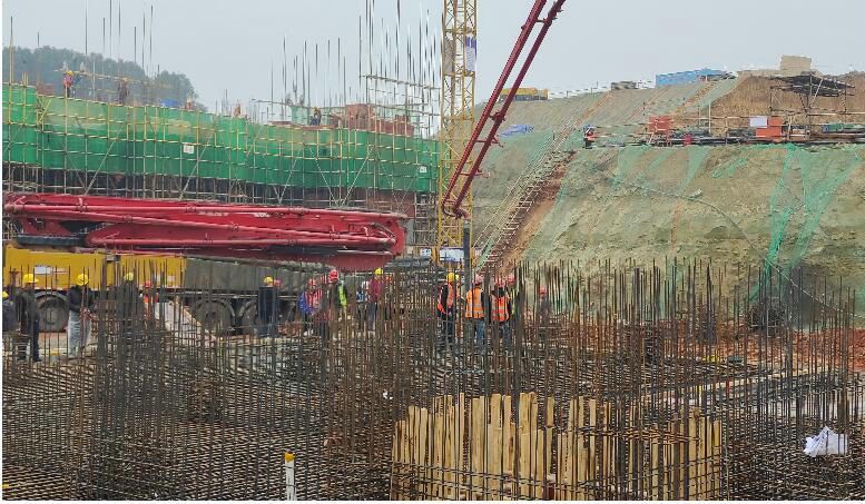 澆筑前,該項目召開專題會議研討,對施工方案進一步優(yōu)化調(diào)整,統(tǒng)籌人、材、機資源合理調(diào)配,在工序節(jié)點控制上仔細斟酌,組織全體施組人員進行安全和施工技術(shù)交底,細致講解施工工藝與安全注意事項,確保全員熟練掌握操作規(guī)范,同時,全面檢查機械設(shè)備正常運轉(zhuǎn)情況,指派專人負責聯(lián)系商砼站及供料車輛,嚴把進場質(zhì)量關(guān)。澆筑過程中,項目技術(shù)管理人員全程24小時輪班駐守現(xiàn)場,及時排查并解決出現(xiàn)的問題,真正實現(xiàn)了安全質(zhì)量零脫控、生產(chǎn)組織零掉檔、現(xiàn)場秩序零紊亂,為澆筑的順利完成提供了保障,實現(xiàn)了澆筑過程中的銜接配合高效率、無失誤。