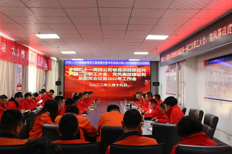 踔厲奮進擔使命,奮擊篤行啟新程!為動員干部職工集中思想、迅速行動、狠抓落實,以更高效率全身心投入工作,確保年度工作“開門紅”。2月19日,中鐵二十一局四公司銀昆高速公路項目經(jīng)理部召開了一屆二次職工大會、黨風廉政建設(shè)和反腐敗會議暨2022年施工大干動員大會。項目部領(lǐng)導(dǎo)班子、副部長以上人員、各工區(qū)經(jīng)理、副經(jīng)理、技術(shù)主管、技術(shù)員、實驗室主任及拌合站站長參加了會議。會議全面總結(jié)回顧2021年主要工作,分析面臨的形勢任務(wù),明確2022年的工作目標、安排部署重點工作。