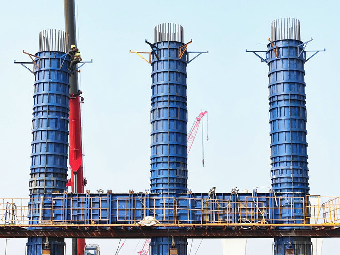 由公司承建的杭甬復(fù)線濱海高架橋于1月10日完成172座橋墩,標(biāo)志著主體工程順利完成,橫越海底直徑4.5米的寧波至舟山輸油管道連續(xù)梁也于去年12月15日成功合攏,正在組織人力和塔吊拆除鋼結(jié)構(gòu)模板。今年的施工重點(diǎn)是濱?;ネ?。該互通設(shè)計(jì)8座匝道橋,有平均80米長(zhǎng)的樁基1027根,172座承臺(tái)、634個(gè)墩柱、67聯(lián)441片鋼箱梁,尚未完成的樁基81根、承臺(tái)48座、墩柱441座、鋼箱梁64聯(lián)435片。今年業(yè)主下達(dá)的產(chǎn)值計(jì)劃是51332.57億元,這是杭甬項(xiàng)目總投資21.57億元最后階段的施工產(chǎn)值,實(shí)現(xiàn)12月底完成架梁目標(biāo),任務(wù)量與往年相比少3億多,工程量不算太大,卻并不意味著可以輕松拿下,需要攻克樁基、承臺(tái)、墩柱施工和鋼箱梁生產(chǎn)、架設(shè)堡壘。