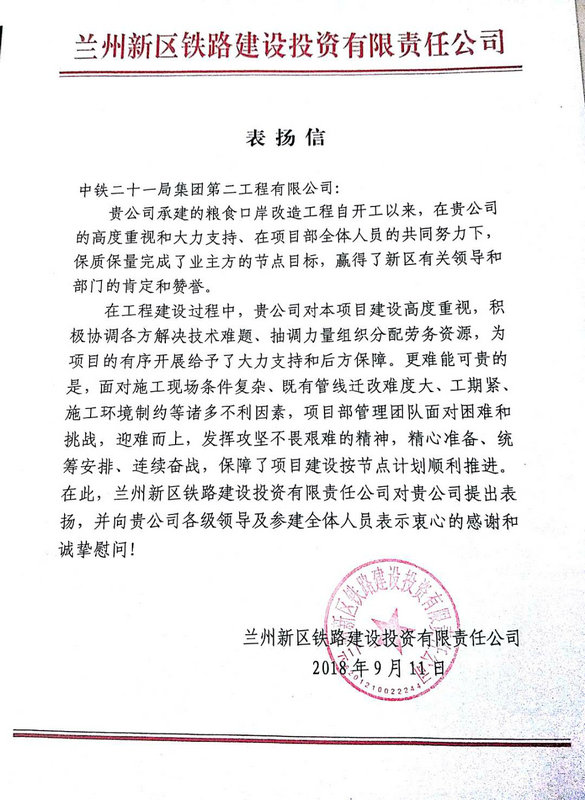 9月11日,中鐵二十一局集團(tuán)二公司蘭州新區(qū)北站物流園糧食口岸項(xiàng)目部收到蘭州新區(qū)鐵路建設(shè)投資有限責(zé)任公司的表揚(yáng)信。對(duì)項(xiàng)目部自開工建設(shè)以來深度參與新區(qū)“一帶一路”的建設(shè)規(guī)劃,保證項(xiàng)目按照既定節(jié)點(diǎn)目標(biāo)順利實(shí)現(xiàn)作出的努力表示感謝。