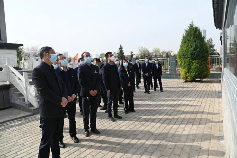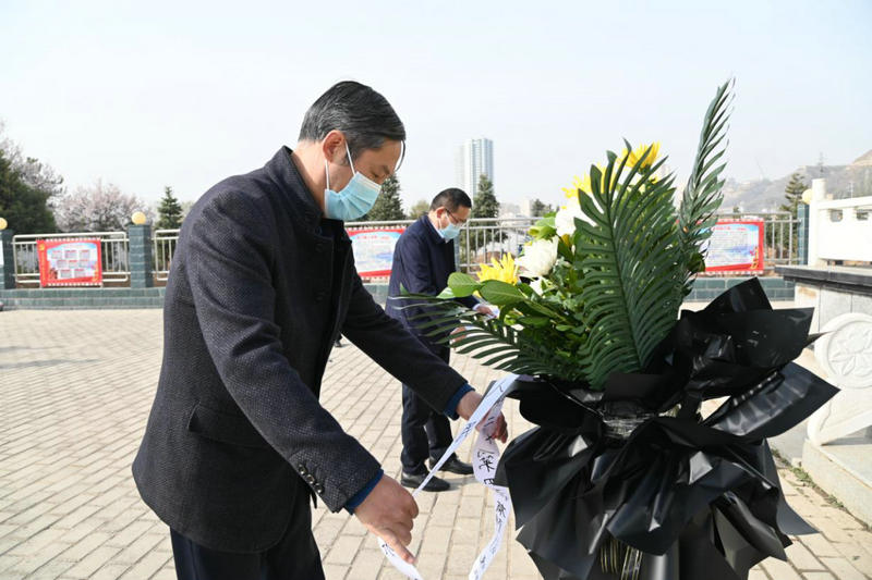 春日的烈士陵園內,翠柏青青,蒼松肅立,氣氛莊嚴肅穆,革命烈士紀念碑巍然屹立,“革命烈士永垂不朽”八個鎏金大字格外醒目。在公祭革命烈士紀念碑儀式中,全體人員列隊行注目禮,奏唱國歌后,全場肅立,向革命烈士紀念碑三鞠躬。伴著莊嚴肅穆的獻花曲,柳倉太、祁濤緩步上前,仔細整理花籃緞帶,并將花籃敬獻于紀念碑基座前。隨后,大家依次繞行,瞻仰革命烈士紀念碑和烈士英名紀念墻,全體人員紛紛敬獻鮮花。