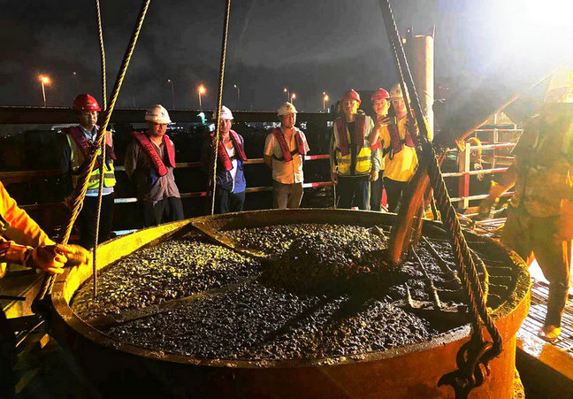 濱?;ネ⒔辉O(shè)計樁基1033根,去年變更后為 1027根,插入海底的樁基直徑1.8—2.5米、深度平均83米。D匝道位于濱?;ネ▋?nèi)環(huán)區(qū)域,畫了一個圓圈,與幾條匝道縱橫交錯。H匝道在濱?;ネㄍ猸h(huán),與著名的寧波—舟山跨海21000米的金塘大橋相接。D、H匝道橋設(shè)計樁基81根,其中H匝道樁基是8條匝道中最少的。今年春節(jié)前,全長4510米的濱海高架橋、主跨135米的連續(xù)梁主體工程相繼完工,之后該項目部將施工重點集中在濱?;ネ?,采取鋼棧橋架設(shè)與主線橋和匝道橋樁基、承臺、墩身全面推進的施工策略,打好2022年關(guān)鍵之年攻堅戰(zhàn)。樁基施工是橋墩作業(yè)的第一道工序,也是第一道關(guān),不能有絲毫馬虎。振插鋼護筒時,在技術(shù)人員指導(dǎo)下進行,做到不偏不倚,以泰山壓頂、排山倒海之勢,將一根根焊接成83米的鋼護筒,一點一點地往下插。由于海底結(jié)構(gòu)復(fù)雜,地質(zhì)不確定因素多,常遇到堅硬的泥巖、砂巖,此時馬上啟用大功率、振插力達(dá)到上百噸的振動錘,在履帶吊的配合下進行作業(yè),直至將鋼護筒插到位。在后續(xù)鉆孔泥漿反循環(huán)和吊裝鋼筋籠作業(yè)時,吊車和人力通力合作,掏空鋼護筒內(nèi)的泥漿后,將鋼筋籠穩(wěn)穩(wěn)地下到海底深處。灌樁時間大部分是晚上,由幾名技術(shù)員在場指導(dǎo)施工,在監(jiān)理和業(yè)主單位工程師見證下順利完成。