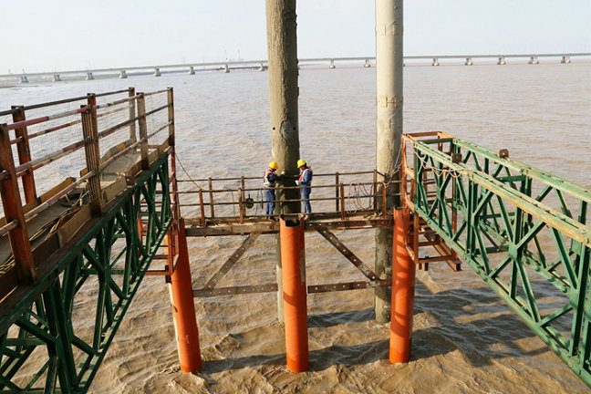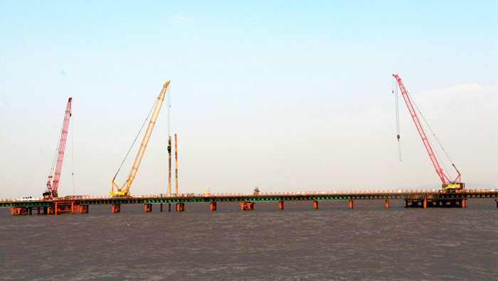 杭甬復(fù)線濱海高架全長(zhǎng)4510米,設(shè)計(jì)鋼棧橋5350米,寬9米,由直徑6—50厘米的鋼管,以及角鋼、鋼板等材料組成,每平方米可承載上百噸重量,是橋梁施工必不可少的海上工程物資運(yùn)輸通道,而棧橋作業(yè)平臺(tái)則是各種材料存儲(chǔ)、中轉(zhuǎn)的“臨時(shí)倉(cāng)庫(kù)”,還設(shè)置了4個(gè)鋼筋籠加工場(chǎng),用途廣泛,在施工中發(fā)揮著不可替代的作用。從2019年8月開工以來,該項(xiàng)目部組織棧橋隊(duì)晝夜不停地架設(shè)寬闊、平整、承重的海上棧橋,為樁基、承臺(tái)、墩身施工提供了便利條件。棧橋每延伸一跨,下構(gòu)樁基和水上牛腿焊接、底板安裝、承臺(tái)和墩身施工緊隨其后,形成“流水作業(yè)”鏈條,一步步向前推進(jìn)。在項(xiàng)目部科學(xué)管理下,經(jīng)過廣大員工艱苦努力,2021年12月25日,與濱海高架一脈相承的主跨135米的連續(xù)梁成功合攏,今年1月8日,濱海高架橋矗立在海上的176座墩身主體完工。此時(shí),該項(xiàng)目部經(jīng)過慎重考慮,作出向業(yè)主報(bào)驗(yàn)橋墩交付架梁?jiǎn)挝?、拆除棧橋的重要決定,每交付一批橋墩,拆除一段棧橋,循序漸進(jìn)。租賃棧橋費(fèi)用,每平方米一天的租金為48元,每公里一天的租金是14000元,包括濱海互通鋼棧橋,全長(zhǎng)14.9公里,費(fèi)用高昂,海上建橋成本高,棧橋費(fèi)是其中之一。