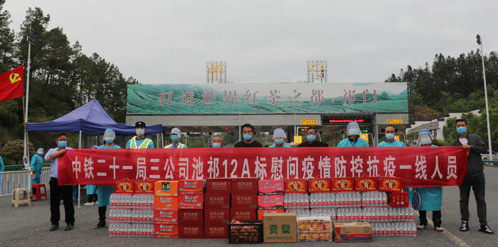 本網(wǎng)安徽黃山4月15日訊(王克亮 陳瀟飛 尹登明)4月14日下午,中鐵二十一局三公司池祁高速12A標(biāo)項(xiàng)目部為感謝堅(jiān)守一線抗疫人員做出的貢獻(xiàn),項(xiàng)目經(jīng)理張一平、副經(jīng)理李惠惠代表項(xiàng)目全體參建員工,帶上礦泉水、方便面,水果、飲料等慰問品向奮戰(zhàn)在抗疫一線人員表示誠摯的慰問!向抗疫人員表達(dá)真誠問候與崇高敬意,感謝他們的為疫情防控付出的辛勞和勇?lián)姑母呱衅焚|(zhì)。