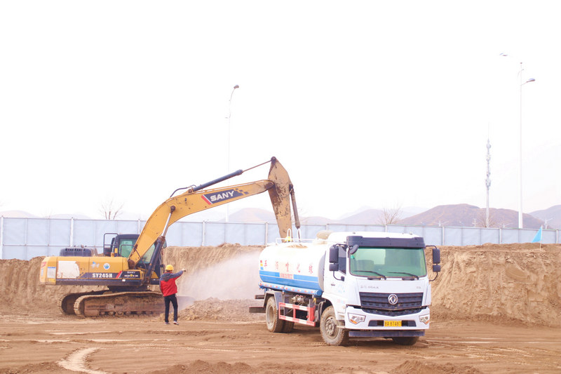 “挖、灑、填、蓋”多步驟,攻堅揚塵治理關。為有效解決施工過程中塵土飛揚“頑疾”,該項目在初期地基施工處理時,就不斷借鑒、探索有效方案措施,并創(chuàng)新出挖、填、灑水相結合、挖灑同步進行的施工方法,形成挖、運、推、填、灑一體化的環(huán)保施工模式,有效抑制了揚塵彌漫;在樓體施工階段,除對場地裸露黃土進行100%覆蓋,還使用密目網對樓棟進行了“包裹式”封閉,同時,嚴格劃分設置材料堆放位置,對工地內各個道路、區(qū)域采用定時打掃和灑水的方式,保持表面濕潤,在部分較嚴重的點位,安置霧炮機進行不間斷凈化降塵。
