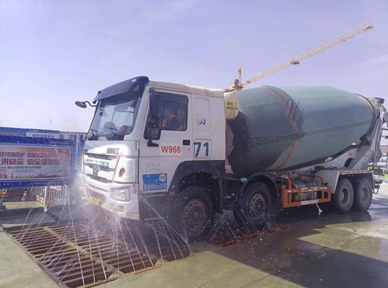 從外圍圓遠觀項目,入目水霧彌漫,圍擋頂端高壓噴射的不間斷噴灑,有效阻斷了場內灰土揚塵“外溢”。此外,為防止運料車輛帶泥上路、污染路面,該項目在大門口安裝自動沖洗臺,對進出車輛進行全面沖洗,并安排專人負責二次“復檢”,在沖洗完畢后,對車底盤、擋板內較“頑固”藏匿地的污泥、砂石進行確認和手動清洗,確保半點兒污染物都不帶出工地。該項目在沖洗臺旁還砌筑二級、三級沉淀池,洗車水經過回流、沉淀、抽取,可以實現(xiàn)最大程度的利用,既有效節(jié)約水資源,也降低了成本,實現(xiàn)了污水“多次”循環(huán)利用。