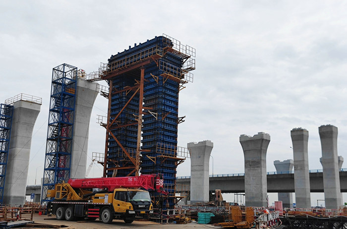 在濱海互通施工中,該項(xiàng)目部確立了打造品牌工程的奮斗目標(biāo),在打好“橋牌”上做文章,從棧橋架設(shè)、插打鋼護(hù)筒、鉆孔泥漿反循環(huán)到安裝鋼筋籠、承臺(tái)和墩身施工,對(duì)每道工序做到無瑕疵,對(duì)亂作為、蠻干行為零容忍,避免海下樁基施工“先天不足”,給后面的工序埋下質(zhì)量隱患。為了將業(yè)主、監(jiān)理單位和公司的質(zhì)量管理規(guī)定落到實(shí)處,使初始目標(biāo)逐漸變?yōu)楝F(xiàn)實(shí),彰顯央企“施工必優(yōu)、爭(zhēng)創(chuàng)一流”的雄厚實(shí)力,該項(xiàng)目部建立嚴(yán)格的質(zhì)量管理體系,從班子成員、部門負(fù)責(zé)人到施工隊(duì),層層簽訂質(zhì)量包保責(zé)任狀,上行下效,上級(jí)做給下級(jí)看,一級(jí)帶著一級(jí)干,項(xiàng)目部、各部門、施工隊(duì)在一條質(zhì)量管理鏈上,縱橫聯(lián)動(dòng)、共同朝著一個(gè)目標(biāo)發(fā)力。與此同時(shí),每月初召開一次施工質(zhì)量研討會(huì),對(duì)上月各工序的施工質(zhì)量進(jìn)行點(diǎn)評(píng)、研判,“雞蛋挑骨頭”般查找管理漏洞和不足,發(fā)現(xiàn)施工過程中有不規(guī)范行為馬上整改,不留后患。其次,對(duì)鋼筋、鋼卷板、水泥、砂石料等主材,在進(jìn)場(chǎng)前對(duì)照標(biāo)準(zhǔn)進(jìn)行嚴(yán)格檢驗(yàn),將不合格材料拒之門外,從源頭阻斷潛在的質(zhì)量風(fēng)險(xiǎn)。
