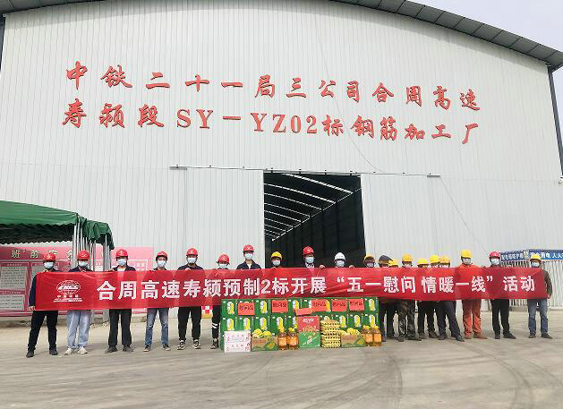 本網(wǎng)安徽阜陽5月1日訊(通訊員 徐文娟) 5月1日上午,中鐵二十一局三公司合周高速壽潁預(yù)制2標(biāo)項(xiàng)目邀請(qǐng)壽潁段第三駐地辦領(lǐng)導(dǎo)一行,深入預(yù)制2標(biāo)施工現(xiàn)場(chǎng)參加“五一”慰問一線工人活動(dòng),向節(jié)日里依然奮戰(zhàn)在工作崗位的一線工人們送上暖心關(guān)懷和節(jié)日祝福,將糧油、水果、防暑降溫飲料等慰問品送到工人手中。并叮囑全體參建工人高溫天氣要注意防暑降溫,勞逸結(jié)合,時(shí)刻做好個(gè)人疫情防控和安全防護(hù)。