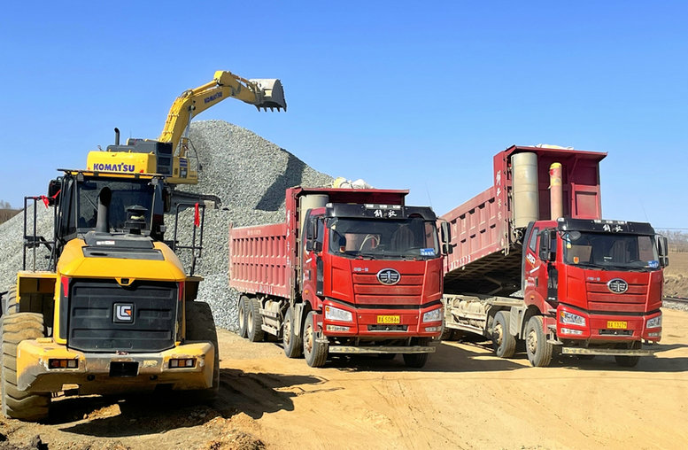 北黑鐵路K261+600至K272+500的10.9公里既有線路基段,需要路基加寬、邊坡護砌、修筑排水溝等改造施工,為九月初線路封鎖創(chuàng)造條件。節(jié)日期間,工人們正在進行路基高填方施工,35臺重型翻斗車正源源不斷地搶運土方,推土機、壓路機配合攤平碾壓,