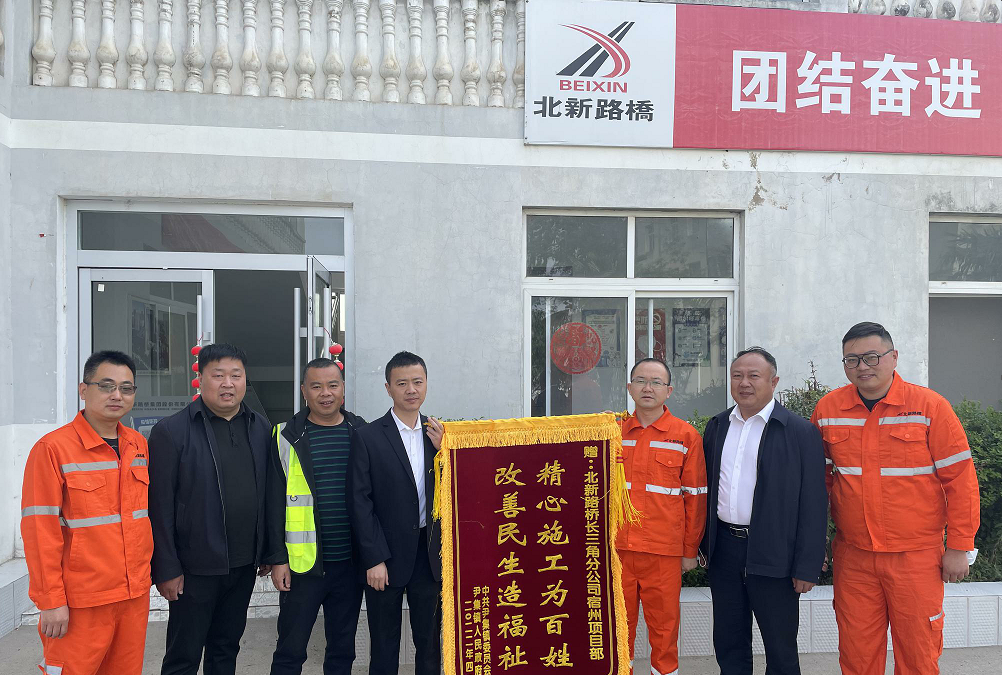 繼獲得項目所在地村委贈送榮譽后,北新路橋長三角分公司宿州項目部再獲地方鄉(xiāng)鎮(zhèn)政府贈送錦旗。近日,安徽省宿州市靈璧縣尹集鎮(zhèn)人民政府將一面寫有“精心施工為百姓,改善民生造福祉”的紅色錦旗送到宿州項目部,感謝項目人員用心守護工程質(zhì)量、全力以赴改善群眾出行條件、助力打造美好幸福生活所作的辛勤貢獻。