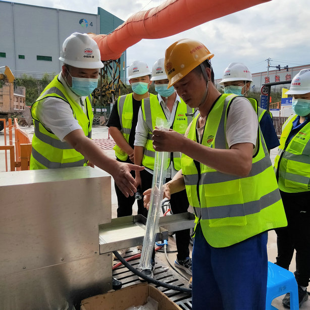 曹元均(左1)與技術人員在指導制作第三代水壓爆破水袋
