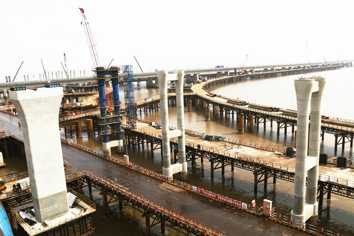 該公司承建的濱?;ネㄈL10090米,是目前亞洲最大的海上互通立交,設(shè)計橋墩811座,由主線橋花瓶墩274座、主線拼寬橋墩80座、金塘拼寬橋墩37座、匝道橋420座組成,氣勢恢宏、蔚為壯觀,是浙江省、寧波市、集團和公司的重點建設(shè)項目,對展示企業(yè)海上施工能力具有名片效應(yīng)。