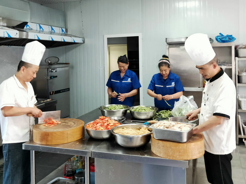 在筑牢疫情防線的同時(shí),項(xiàng)目部制定了食譜和菜譜隨著季節(jié)的變化不斷翻新,張榜員工食堂餐廳公示。員工一日三餐葷素搭配不重樣,實(shí)現(xiàn)了食堂管服人員圍著菜市場轉(zhuǎn)向“菜譜”轉(zhuǎn)的轉(zhuǎn)變。提高了飯菜質(zhì)量,滿足了員工生活需求。