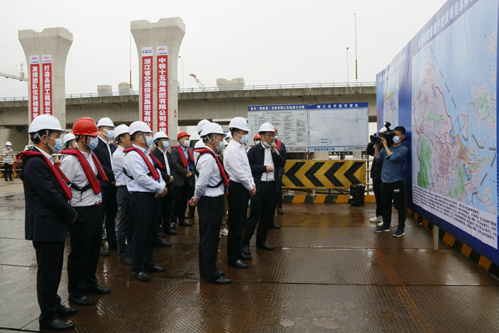 上午9點5分,湯飛帆在寧波市副市長楊勇,寧波市政協(xié)副主席、鎮(zhèn)海區(qū)委書記林雅蓮,市政府黨組成員、秘書長、辦公廳黨組書記朱金茂,市政府辦公廳副主任、黨組成員、市政府研究室副主任陳頂祥及市發(fā)改委、自然資源規(guī)劃局、交通局、財政局、生態(tài)環(huán)境局、住建局、應急管理局主管領導和各區(qū)政府主要負責人陪同下,來到杭甬項目濱?;ネǎ诰薹麄髋魄?,首先聽取了市交通局局長胡海達關于杭甬復線寧波一期高速公路建設情況和S3合同段濱海高架、濱海互通立交施工進展情況的匯報。胡海達介紹說,中鐵十五局承建的濱海高架橋和連續(xù)梁今年初主體完工,在等待架梁,濱?;ネ壳皹痘?、主線橋墩已接近尾聲,8座匝道橋墩柱完成近70%,架設鋼箱梁3跨,第二波架梁的準備工作正在緊張進行,做到樁基、橋墩、架梁同步。項目的安全質量、工程進度和環(huán)保均處于可控狀態(tài)。、浙江省交投交通建設管理有限公司副總經(jīng)理楊成安重點作了補充,對項目的各項工作給予充分肯定。