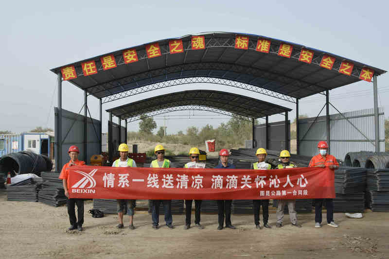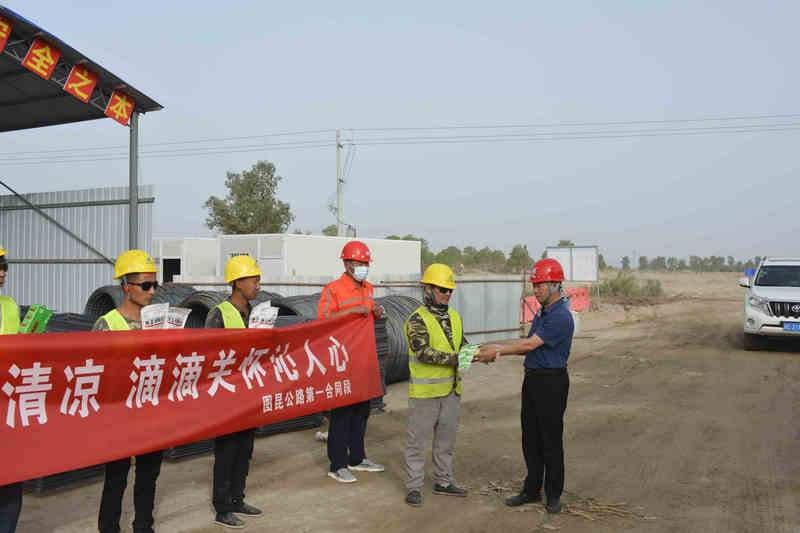 伴隨著炎炎夏日的來臨,地處沙漠邊緣的北新路橋集團圖昆公路(三師段)一標項目(以下簡稱圖昆一標)當?shù)貧鉁夭粩嗌撸瑸榍袑嵶龊孟募臼┕がF(xiàn)場防暑降溫工作,防止因高溫天氣引發(fā)員工中暑事故的發(fā)生,保障勞動者職業(yè)健康。圖昆一標項目部多措并舉抓好高溫期間職工勞動保護和防暑降溫工作,關心職工的生命安全與健康,確保施工生產(chǎn)活動的有序進行。