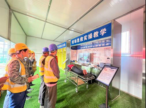 活動現(xiàn)場,通過設(shè)立安全知識展板、懸掛安全宣傳條幅、播放安全警示視頻、發(fā)放《施工安全手冊》、急救體驗、安全生產(chǎn)“我承諾”等形式,為參與人員搭建普及安全生產(chǎn)知識的橋梁。安全管理人員耐心細致地向工人講解安全三寶、用電常識、高空作業(yè)安全保護等,并為工友一一答疑解惑?;顒又泄舶l(fā)放安全小冊子280份,接受現(xiàn)場工人咨詢56人次,內(nèi)容涉及一線員工普遍關(guān)注的安全生產(chǎn)相關(guān)政策法規(guī)、生產(chǎn)安全事故的預(yù)防和應(yīng)急處理、生產(chǎn)安全事故的社會保障服務(wù)、職業(yè)健康知識等方面。