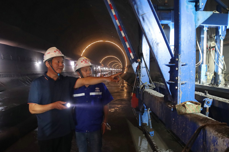 黨員、項(xiàng)目副經(jīng)理邱書貴(左1)在中梁山隧道光纜臺(tái)車解決施工有關(guān)問題