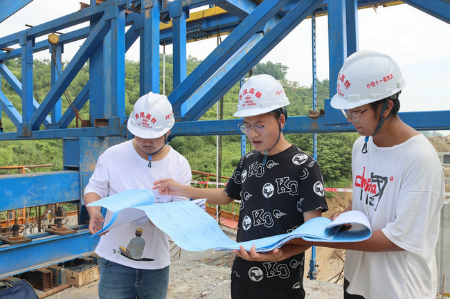 黨支部委員、總工程師朱君(左2)在樓子溝特大橋現(xiàn)場解決有關(guān)施工技術(shù)問題