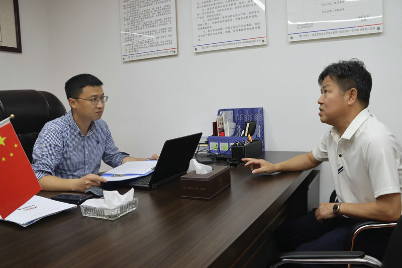 黨支部副書記、項(xiàng)目經(jīng)理劉超(左)為工區(qū)解決施工有關(guān)問題