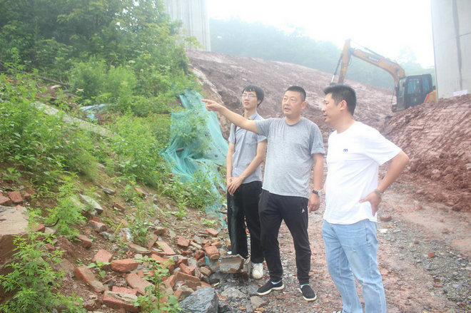 黨支部書記張曉龍(右2)在現(xiàn)場向項(xiàng)目協(xié)調(diào)人員安排復(fù)地綠化工作