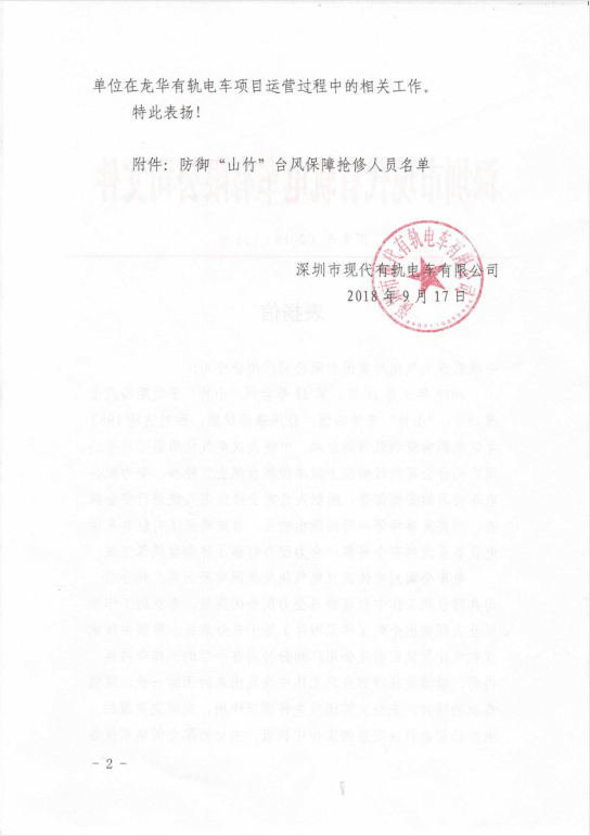 2018年9月16日,中鐵武漢電氣化局廣州分公司收到圳現(xiàn)代有軌電車公司表?yè)P(yáng)信,感謝中鐵武漢電氣化局廣州分公司廣深項(xiàng)目部在臺(tái)風(fēng)“山竹”期間,積極配合電車公司抵御臺(tái)風(fēng)、確保設(shè)備系統(tǒng)正常運(yùn)行所做出的突出貢獻(xiàn)。