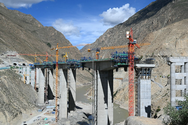 據(jù)悉,雅魯藏布江大橋連續(xù)剛構(gòu)箱梁左右幅合計800米,截止目前,已完成500米連續(xù)剛構(gòu),剩余300米預(yù)計9月初完成澆筑任務(wù)。
