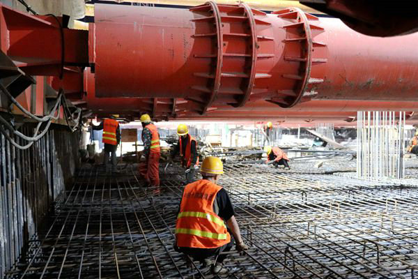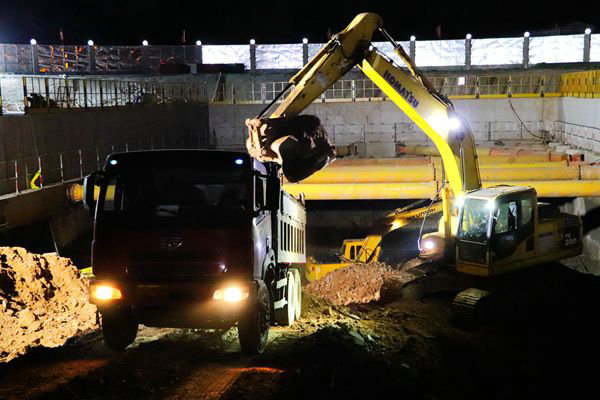 9月18日晚上9時(shí)許,我在汽車公園站,目睹施工現(xiàn)場(chǎng)人來人往,機(jī)聲轟鳴,鋼筋場(chǎng)的員工有的在下料,有的在加工綁扎鋼筋籠的開口套,吊車在倒運(yùn)材料、塔吊在為基坑里面的員工吊裝材料,基坑里面的員工在綁扎鋼筋籠、立模板,整個(gè)施工現(xiàn)場(chǎng)環(huán)環(huán)相扣、緊張有序、忙而不亂。據(jù)來自江西的王師傅介紹,他平均一天能夠加工開口套1500多個(gè)。
