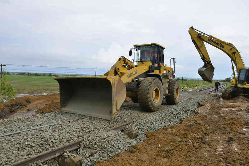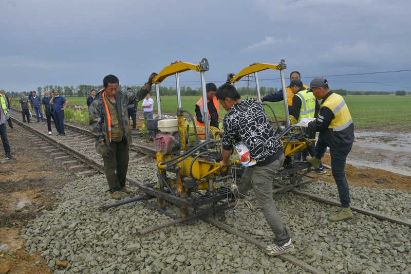 此時(shí)水害現(xiàn)場(chǎng),大雨入注一陣緊似一陣,肆虐的洪水夾雜著折斷的樹枝和石塊從山上奔瀉而下,搶險(xiǎn)人員不顧一切與暴風(fēng)雨展開搏擊,趟過深一腳、淺一腳的泥水,人抬肩扛一溜小跑搶運(yùn)物料,40多分鐘便筑起了一道50余米長(zhǎng)的堤壩,阻止洪水再次侵襲路基,為后續(xù)清淤和水毀路基修復(fù)施工打開通道。接著挖掘機(jī)、裝載機(jī)、自卸車進(jìn)入現(xiàn)場(chǎng),在機(jī)械轟鳴中開始清除滯留的淤泥、石塊等廢物,清理現(xiàn)場(chǎng)平整路基,填筑應(yīng)急儲(chǔ)備砟石115立方米。搶險(xiǎn)隊(duì)員緊隨其后,整理路基道床、搗固線路、檢查線路幾何尺寸,爭(zhēng)分奪秒修復(fù)線路,檢查線路周邊地區(qū)水害和下游排水疏通情況......