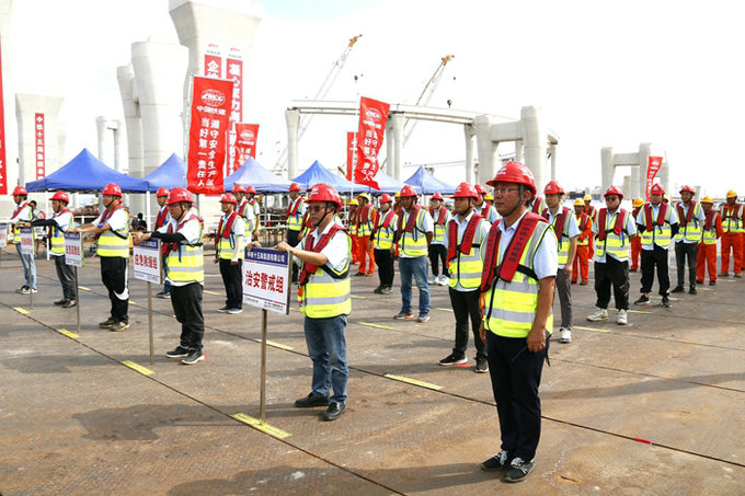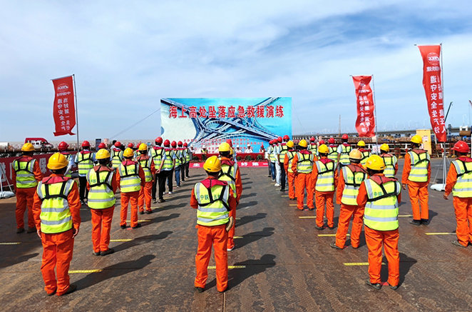 由5家單位聯(lián)合舉辦的防高空墜落應(yīng)急救援演練,旨在教育引導(dǎo)廣大管理人員、作業(yè)工人增強安全防范意識,從思想上、行動上高度重視高墩施工安全,確保萬無一失。為辦好這次演練,該項目部擬定了切合實際的“海上防高處墜落應(yīng)急救援演練”實施方案,提前兩天組織一艘海上護衛(wèi)船和有關(guān)人員冒著酷暑,在烈日下進行緊張有序的預(yù)演,每一個環(huán)節(jié)反復(fù)多次,達不到預(yù)期效果不罷休,以精益求精的態(tài)度和為企業(yè)爭光的敬業(yè)精神,為這次正式演練做了充分準(zhǔn)備。同時,搭建了簡易臺子和背景墻、電子屏,為達到演練的視覺效果和彰顯央企風(fēng)采起到了錦上添花的作用。