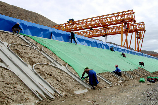 由于項(xiàng)目地處海拔4000米的高原河谷地帶,植被稀疏,風(fēng)沙大,生態(tài)環(huán)境極度薄弱。為保護(hù)環(huán)境減少揚(yáng)塵,項(xiàng)目部在完成邊坡骨架防護(hù)工作后,聘用當(dāng)?shù)夭刈迦罕娭膊菰曰?。為適應(yīng)當(dāng)?shù)丨h(huán)境氣候,特意選用格桑花與黑麥草進(jìn)行混合播種,項(xiàng)目部在播撒草籽后用防塵蓋土網(wǎng)覆蓋,并安排水車每天灑水一次,確保草種順利發(fā)芽。