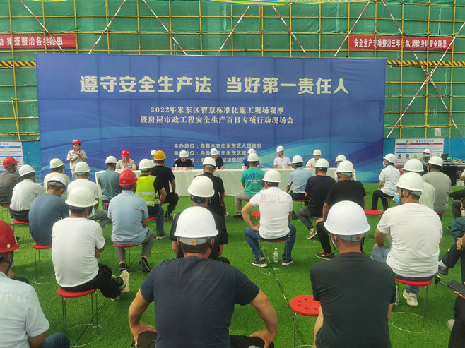 烏魯木齊訊(李楊)近日,新疆兵團城建集團有限公司與烏魯木齊市米東區(qū)人民政府、烏魯木齊市米東區(qū)建設局共同在兵團十一師黨校項目召開2022年米東區(qū)智慧標準化施工現(xiàn)場觀摩暨房屋市政工程安全生產(chǎn)月百日專項行動現(xiàn)場會,共有66家建筑施工單位參加了觀摩交流會議。集中學習安全生產(chǎn)法,集中組織第一責任人共同進行安全倡議書公開承諾,學習兵團十一師黨校項目安全生產(chǎn)好的經(jīng)驗做法。烏魯木齊市米東區(qū)建設局對安全生產(chǎn)工作提出要求,一是要思想上高度重視安全生產(chǎn)工作;二是行業(yè)部門嚴格執(zhí)法,落實安全生產(chǎn)法,加強大排查;三是企業(yè)主體責任落實,作用發(fā)揮,嚴格履行職責。
