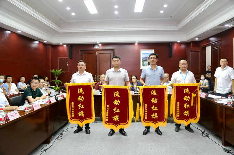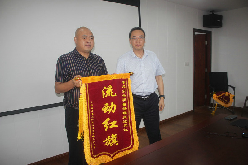 中鐵建重慶軌道交通15號(hào)線總承包部黨工委副書記王向平(右)為項(xiàng)目部獲得總承包部二季度安全質(zhì)量管理先進(jìn)崗位“中梁山隧道進(jìn)口監(jiān)督崗”授錦旗