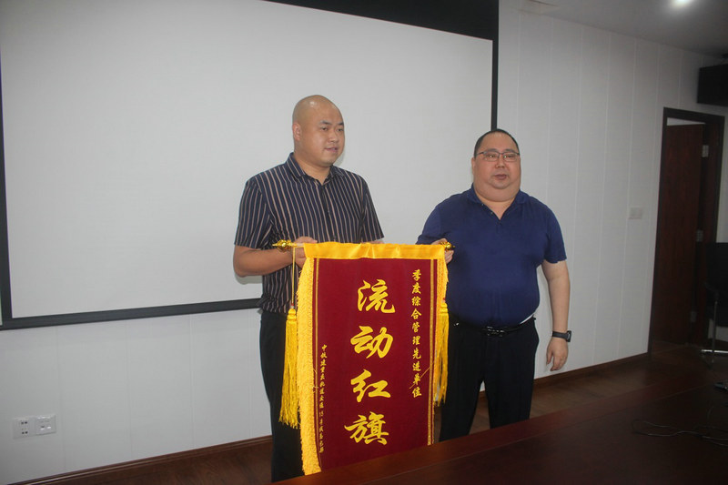 中鐵建重慶軌道交通15號(hào)線總承包部指揮長(zhǎng)李兵(右)為項(xiàng)目部獲得總承包部二季度綜合管理先進(jìn)單位授錦旗