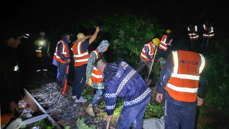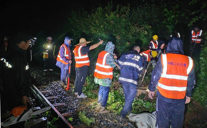“今天傍晚的持續(xù)強降雨導致渾白鐵路三處路塹邊坡滑坡,危及鐵路行車安全,請求支援”。7月23日20時19分,隨著一陣急促的手機鈴聲響起,中鐵二十三局集團沈白高鐵項目部三分部接到了通化鐵路工務段泉陽線路車間書記李同旭的求援電話,分部經理郭曉斌聞“汛”而動,迅速調集車輛、集結人員,火速奔赴水害現場......