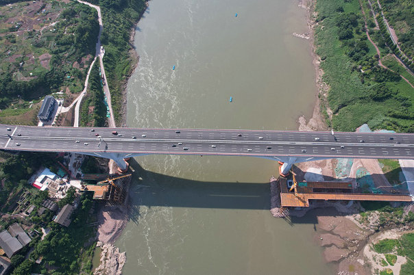 廖家溪軌道專用橋橋型設(shè)計(jì)為空腹鋼斜撐連續(xù)鋼構(gòu),孔跨布置為150+245+190+130+85,全長800米,自西向東橫跨嘉陵江,江內(nèi)采取與上游禮嘉嘉陵江大橋平行對孔設(shè)計(jì),梁橋相距約14米。P1、P2主墩上部結(jié)構(gòu)下弦梁設(shè)計(jì)為鋼斜撐,上弦梁設(shè)計(jì)為預(yù)應(yīng)力混凝土梁,橋高72米,橋面寬13.6米,主跨245米,具有跨度大、高度較高、涉水施工及主墩上部結(jié)構(gòu)三角區(qū)施工要求高、組織難度大等顯著特點(diǎn)。