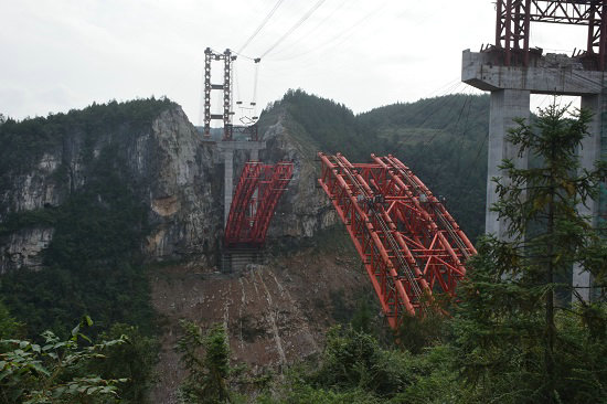 由于橋址區(qū)屬構(gòu)造溶蝕侵蝕低山丘陵地貌區(qū),深切割“V”峽谷斜(陡)地形,斜坡坡度較大,兩岸地形陡峭,局部近似直立狀,地形起伏較大,大橋施工環(huán)境極其險惡。大橋軸線經(jīng)過地段地面標(biāo)高在510~693m之間,相對高差約183米。本橋橫跨找龍壩河,河流整體呈東西走向,河谷底部寬約20米,頂部寬約230米,河谷兩岸坡面上植被較發(fā)育,多為喬木、灌木。施工難度相當(dāng)大,工期十分緊,是全線的卡控點工程。自2017年5月開工以來,項目部克服諸多困難,做好施工方案評審及優(yōu)化、纜索吊機(jī)安裝及測試、首節(jié)段驗收等各項工作,施工現(xiàn)場如火如荼,科學(xué)組織,緊張有序向前推進(jìn)。今年4月30日完成主拱肋的首節(jié)段吊裝,目前吊裝施工有條不紊地進(jìn)行,為深山峽谷施工積累了豐富經(jīng)驗。