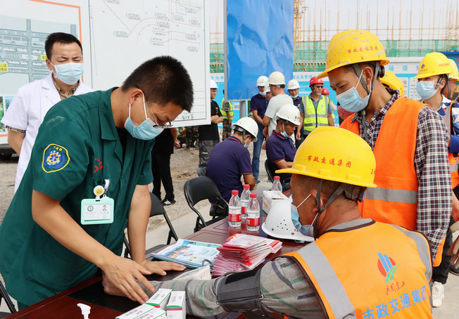 圖為第三師圖木舒克市總工會慰問安居工程建設(shè)項目現(xiàn)場(王航平攝) 在慰問現(xiàn)場,第三師圖木舒克市總工會工作人員向一線施工人員發(fā)放了《工會法》等相關(guān)宣傳手冊,并耐心講解了在高溫作業(yè)下如何預(yù)防中暑、如何開展自救等自我保護(hù)方面的常識;同行的醫(yī)護(hù)人員為現(xiàn)場管理人員和勞務(wù)人員測量血壓,切實把“清涼”“關(guān)愛”送到全體參建人員的心坎里。