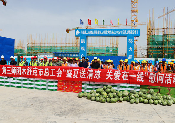 圖木舒克訊(通訊員王航平)近日,第三師圖木舒克市總工會、圖木舒克市人民醫(yī)院醫(yī)護(hù)人員及業(yè)主代表一行帶著西瓜、飲料等慰問品,來到兵團(tuán)建工市政交通集團(tuán)北新土木公司承建的圖木舒克市 2022年安居工程建設(shè)項目施工現(xiàn)場開展“盛夏送清涼、關(guān)愛在一線”慰問活動。