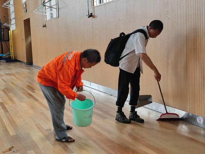 9月5日下午3點(diǎn),根據(jù)臺(tái)風(fēng)“軒嵐諾”強(qiáng)度逐漸減弱,對員工生命安全不再構(gòu)成威脅的實(shí)際,安置在鎮(zhèn)海澥浦中學(xué)體育館的十五局杭甬項(xiàng)目部施工人員要離開這里。臨行前,他們各自收拾好行李,將個(gè)人遺留在地板上的垃圾拾到紙箱里,集中處理。待收拾妥當(dāng),員工們有序地排成隊(duì),依次走出大門,上了等候在院內(nèi)的車輛,返回駐地。體育館大廳里還有一些廢紙碎屑沒清理干凈,王繼劍安排5名員工認(rèn)真仔細(xì)地進(jìn)行地毯式的清掃,包括每個(gè)角落都打掃得干干凈凈,就像沒來過一般。