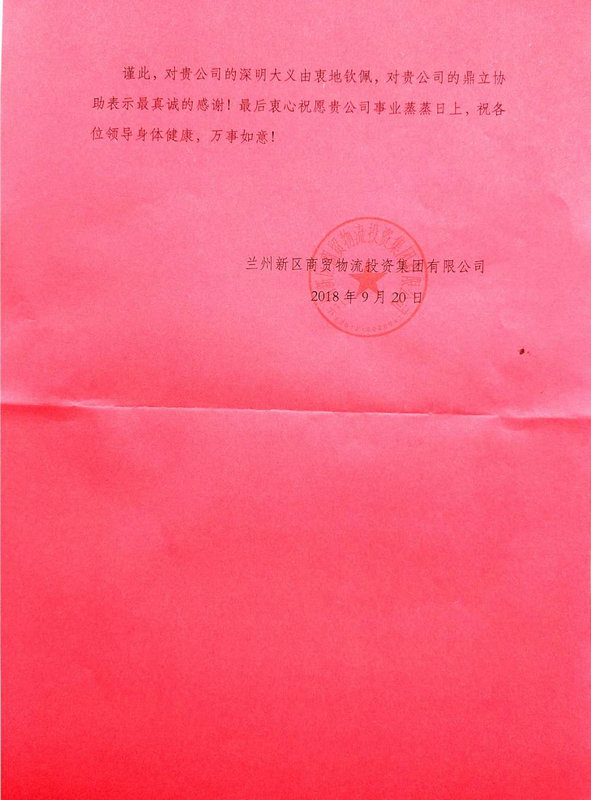 信中指出:精準(zhǔn)扶貧系國運(yùn),幫扶援建暖民心。貴公司深明脫貧攻堅(jiān)之大義,在接到救援扶助信后,特派蘭州新區(qū)鐵路口岸貨4、貨7線項(xiàng)目部,在項(xiàng)目部副經(jīng)理劉明兒的親自督導(dǎo)下,僅用3天時(shí)間便完成了對建新村村委會的改造工程任務(wù)。共重修圍墻180米、新建廁所20平米、新建庫房40平米,總投資10萬元。項(xiàng)目部主要負(fù)責(zé)人于百忙之中到我單位幫扶村進(jìn)行實(shí)地調(diào)研與商談結(jié)對聯(lián)系工作,為建新村迅速制定了援建計(jì)劃,在促進(jìn)新區(qū)商貿(mào)物流投資單位脫貧攻堅(jiān)工作的同時(shí),提振了幫扶村脫貧致富、振興發(fā)展和建設(shè)全面小康社會的信心,樹立了發(fā)揮合力共推脫貧攻堅(jiān)行動的典范。