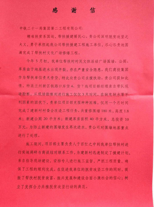 (通訊員 權(quán)航)9月26日,中鐵二十一局集團(tuán)二公司貨四貨七項(xiàng)目部還在現(xiàn)場督導(dǎo)施工的副經(jīng)理欣喜的接過由蘭州商貿(mào)物流投資集團(tuán)有限公司送來的關(guān)于“精準(zhǔn)扶貧建設(shè)工作”感謝信。