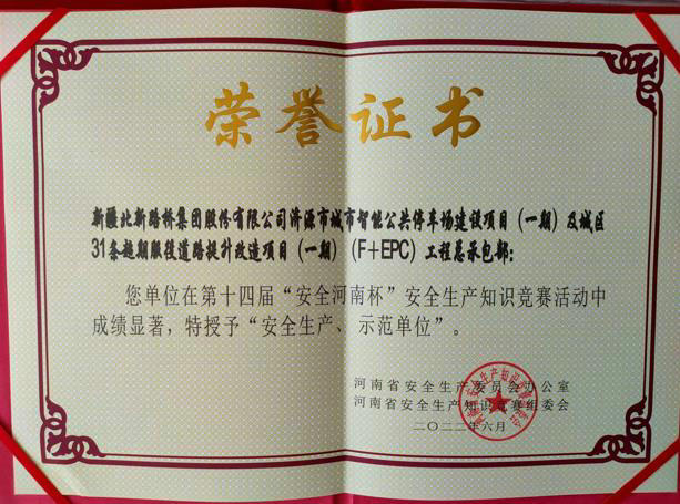 近日,從河南省安全生產(chǎn)委員會(huì)辦公室傳來(lái)喜訊,北新路橋集團(tuán)西安分公司河南濟(jì)源市政工程項(xiàng)目在第十四屆“安全河南杯”安全生產(chǎn)知識(shí)競(jìng)賽活動(dòng)中成績(jī)突出,榮獲河南省安全生產(chǎn)委員會(huì)辦公室、河南省安全生產(chǎn)知識(shí)競(jìng)賽組委會(huì)聯(lián)合授予“安全生產(chǎn)示范單位”獎(jiǎng)牌及榮譽(yù)證書(shū)。