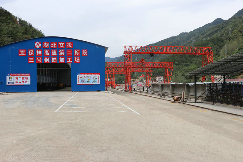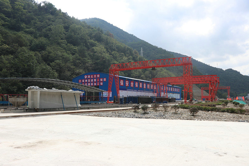 在“地?zé)o三尺平”的湖北省保康縣,要從施工線上找到一塊可以制梁、存粱的地段實(shí)屬不易。項(xiàng)目部對梁場選址高度重視,不斷優(yōu)化選址方案,綜合考慮地形、運(yùn)輸、征拆等多方面因素,最終確定在k7+710-k7+960主線路基上進(jìn)行建設(shè),雖然此段路基南側(cè)靠山,北側(cè)臨水(河道)需要架橋,施工繁瑣,但其地形較為平坦,利于鋼筋加工棚等配套設(shè)施搭建,且緊鄰項(xiàng)目橋梁密集地(高碑3.4.5號橋)并與實(shí)驗(yàn)室、拌合站毗鄰,不僅方便混凝土的輸送,在架梁時還可以縮短運(yùn)梁距離,大大提高施工效率。