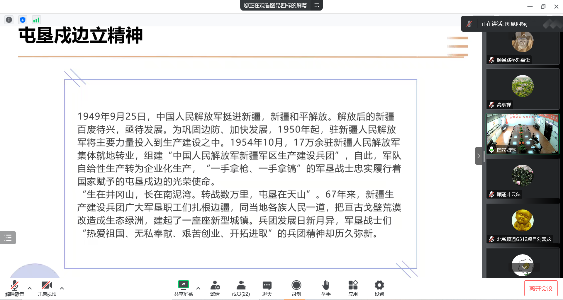 兵團(tuán)職工代表王維軍為大家講述了革命老兵們?cè)谕蛪ㄊ叺募t色故事和勵(lì)志精神,要學(xué)習(xí)他們胸懷全局、顧全大局的精神境界。“作為引領(lǐng)時(shí)代未來的主力軍,應(yīng)當(dāng)擁抱新時(shí)代,緬懷先輩付出。在深入基層中強(qiáng)歷練,在勇?lián)厝沃写僬衽d,讓兵團(tuán)精神“活”起來;“走”出去!”