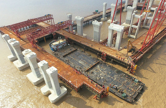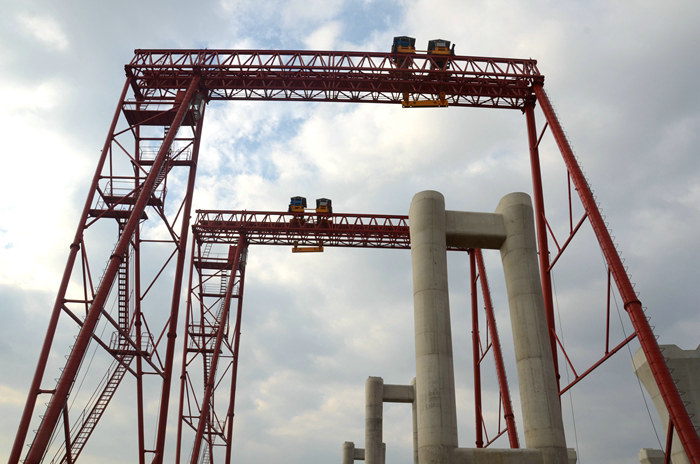 濱?;ネㄔO(shè)計(jì)4座拼寬橋、8座匝道橋、441片鋼箱梁和疊合梁,現(xiàn)已架設(shè)20跨、40片梁,60米橋面板澆筑完畢。尚有401片長(zhǎng)20——60米、重20——30噸的鋼箱梁、疊合梁從舟山生產(chǎn)廠家走海上運(yùn)輸至施工現(xiàn)場(chǎng)。前提20米長(zhǎng)、20噸重的鋼箱梁通過(guò)輪船海上運(yùn)輸至石化區(qū)碼頭,再?gòu)拇a頭倒運(yùn)至現(xiàn)場(chǎng),租賃碼頭、繞一圈運(yùn)到目的地的成本太高,不利于降本增效。項(xiàng)目部主管領(lǐng)導(dǎo)經(jīng)過(guò)反復(fù)計(jì)算,得出的數(shù)據(jù)顯示,自建卸梁站和提梁站,貨船從舟山走海域直接將梁運(yùn)至工地,省時(shí)省力省錢(qián)。7月13日建成的卸梁站高36米、寬16.8米,下方是一個(gè)長(zhǎng)方形??控洿?、卸梁的海上航道。這個(gè)航的道水位約10米深,是經(jīng)過(guò)近3個(gè)月兩臺(tái)長(zhǎng)臂挖掘機(jī)開(kāi)挖而成的。由于每天有兩次潮汐,挖好的航道又涌進(jìn)大量淤泥,給開(kāi)挖造成很大困難,通過(guò)鋼板攔截等辦法,最終將這個(gè)航道開(kāi)掘成功。此后,將源源不斷地從舟山運(yùn)梁到現(xiàn)場(chǎng),在兩座各74米長(zhǎng)、36米高、15米寬、200噸負(fù)荷的提梁站配合下,架梁進(jìn)度將大大加快,為明年6月底完成全部架梁任務(wù)創(chuàng)造了有利條件。